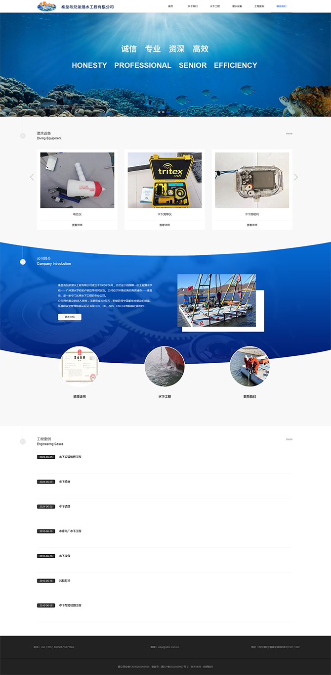 秦皇島兄弟潛水工程有限公司成立于2000年06月,由畢業(yè)于我國(guó)唯一的工程潛水學(xué)!獜V州潛水學(xué)校的盧銘臣等共同創(chuàng)立。公司位于環(huán)境優(yōu)美的海濱城市——秦皇島,是一家專(zhuān)門(mén)從事水下工程的專(zhuān)業(yè)公司。