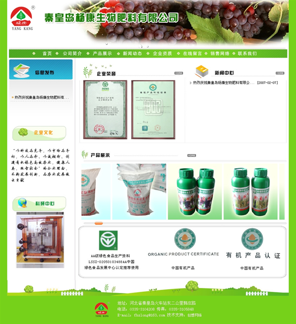 秦皇島楊康生物肥料有限公司坐落于全國著名的旅游海濱城市--------秦皇島.公司始建于1998年,引進(jìn)了美國新菌種技術(shù),結(jié)合我國的農(nóng)業(yè)生產(chǎn)實(shí)際,生產(chǎn)微生物葉面肥、微生物有機(jī)肥、有機(jī)無機(jī)復(fù)混肥,是華北地區(qū)較大的有機(jī)肥、葉面肥、有機(jī)無機(jī)復(fù)混肥的生產(chǎn)基地。公司為哈茲集團(tuán)、中國糧油華夏長城(昌黎)釀酒有限公司的萬畝釀酒葡萄基地、中國糧油煙臺(tái)長城釀酒有限公司釀酒葡萄基地、朗格斯酒莊(秦皇島)有限公司等基地供應(yīng)肥料,其產(chǎn)品遠(yuǎn)銷泰國、馬來西亞、韓國、黑龍江、新疆、山東、山西、福建、河北、河南等國家和地區(qū)。