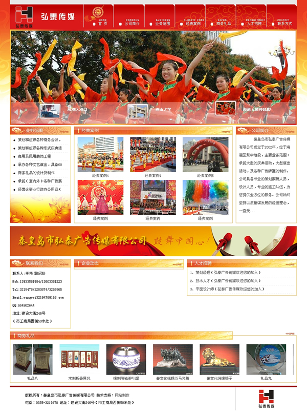 秦皇島市弘泰廣告?zhèn)髅接邢薰境闪⒂?002年,位于海港區(qū)繁華地段,主要業(yè)務(wù)范圍:承攬大型的慶典活動(dòng),大型演出活動(dòng),及各種廣告牌匾的制作。公司具備專業(yè)的策劃撰稿人員,設(shè)計(jì)人員,專業(yè)的施工隊(duì)伍,為您提供全方位的服務(wù)。公司始終堅(jiān)持以質(zhì)量謀發(fā)展的經(jīng)營(yíng)理念,一直受到合作單位的信賴與好評(píng)。成功舉辦過(guò)“全國(guó)首屆校園歌手電視大賽”,“廣場(chǎng)音樂(lè)會(huì)”,“08年奧運(yùn)會(huì)海上安保演習(xí)”,“新天地購(gòu)物廣場(chǎng)開(kāi)業(yè)”等大型活動(dòng)。