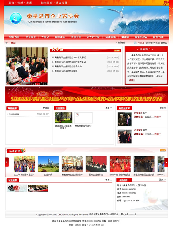 秦皇島市企業(yè)家協(xié)會(huì)于2006 年12月28日正式成立。該會(huì)是在市委、市政府支持培育下,經(jīng)市民政局登記注冊(cè),市發(fā)改委為主管部門的具有法人地位的社會(huì)團(tuán)體。是企業(yè)(雇主)和企業(yè)家的代表,是企業(yè)和企業(yè)經(jīng)營(yíng)者的聯(lián)合組織,是以企業(yè)為主體,吸收管理界、新聞界、學(xué)術(shù)界、政法界的領(lǐng)導(dǎo)與專家組成的非政府、非營(yíng)利性社團(tuán)組織。是溝通企業(yè)與政府、企業(yè)與企業(yè)、企業(yè)與社會(huì)間聯(lián)系的橋梁和紐帶。