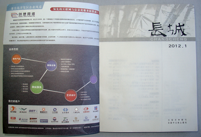 新年伊始,創(chuàng)想網(wǎng)絡做為秦皇島開發(fā)區(qū)的明星推薦企業(yè),榮登全國中文核心期刊《長城》的封面!堕L城》期刊由河北省作家協(xié)會主辦,是中國中文核心期刊,同時被美國國家圖書館館藏。